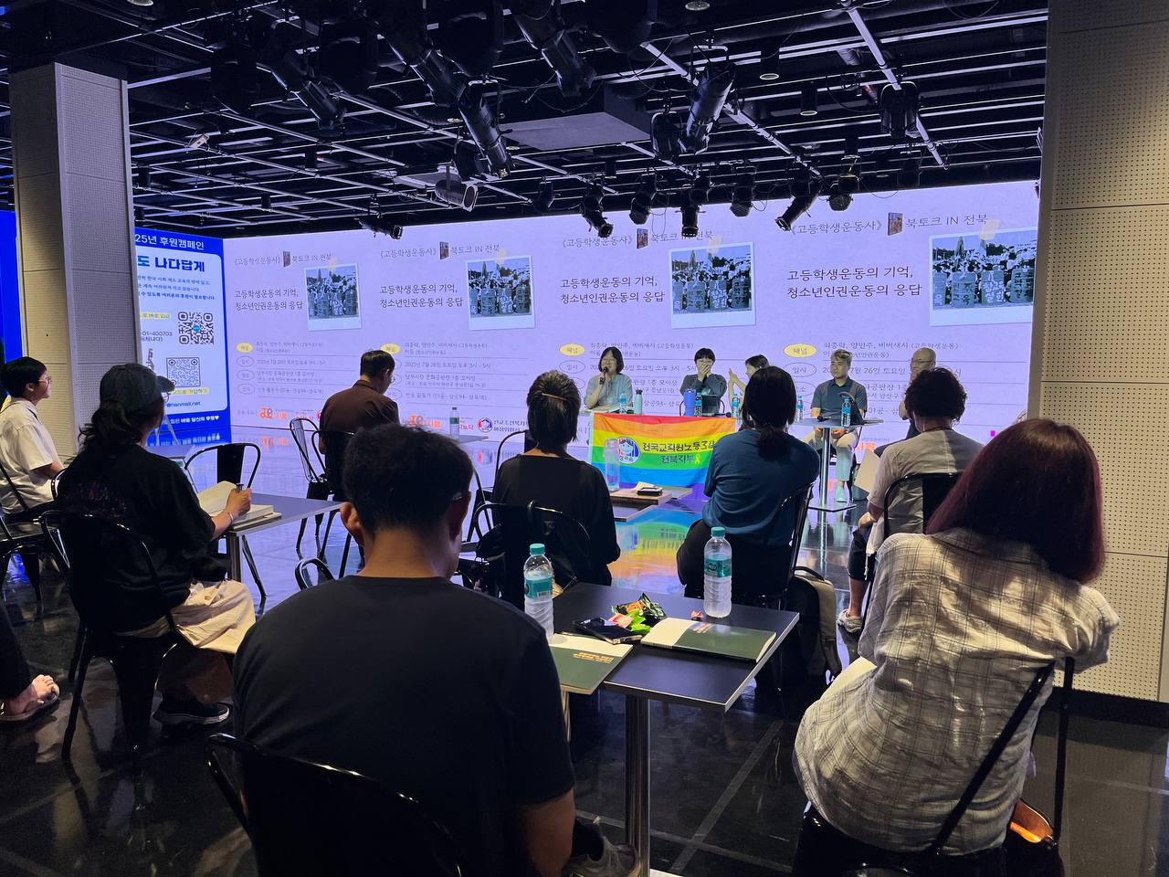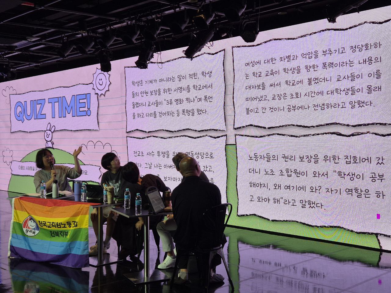 패널로는 《고등학생운동사》의 공저자이자 현재 전북에서 전교조 활동을 하고 있는 양민주 님, 전북 정읍 지역에서 고등학생운동을 했던 최종락 님, 고등학생운동 세대에 해당하지만 조직적 활동을 한 적은 없으며 지금은 청소년인권운동을 하는 교사인 비비새시 님, 전주에서 청소년인권운동을 한 이름 님이 함께했습니다.