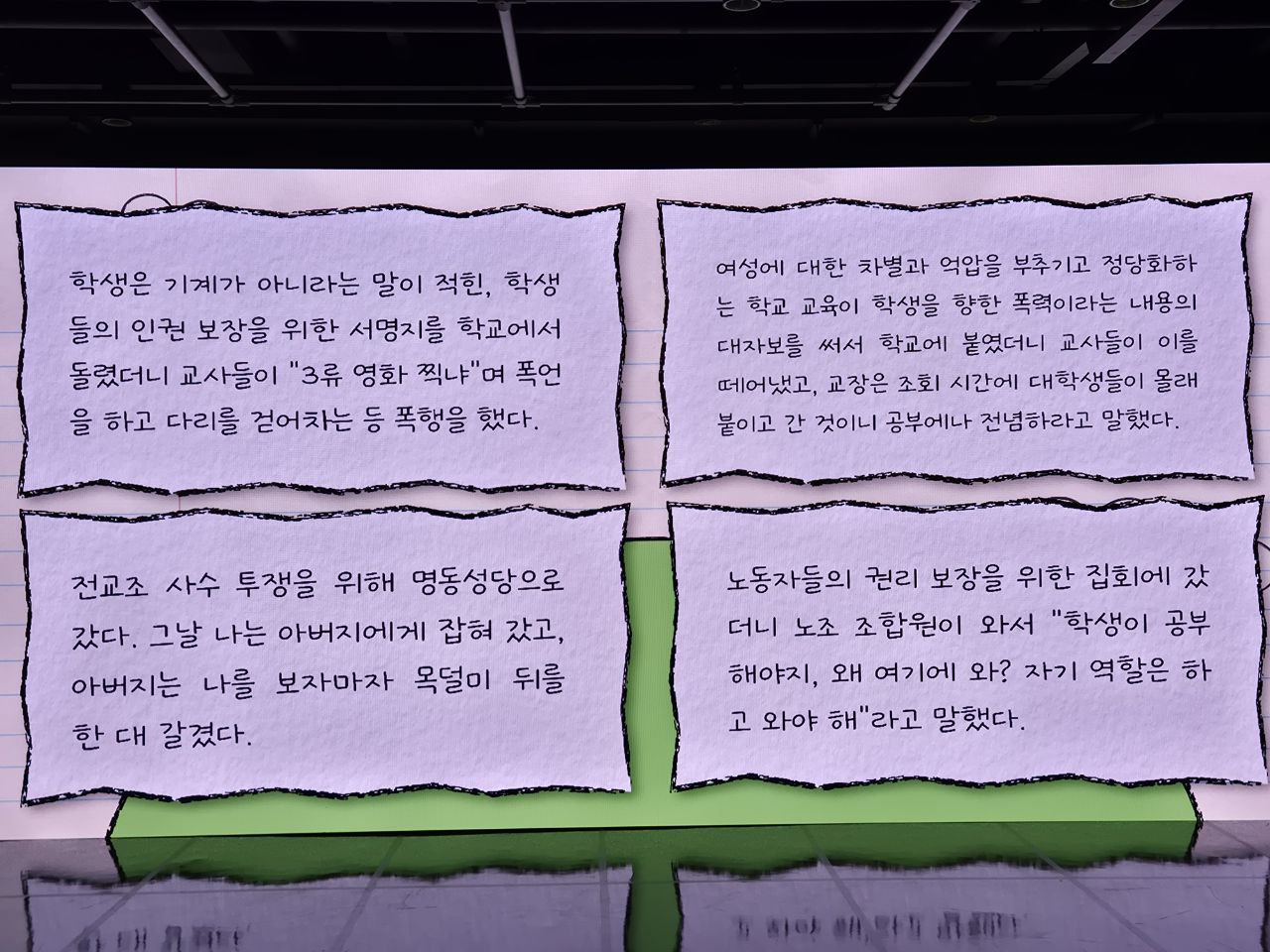행사가 열린 모이장은 여러 전시나 공연을 할 수 있을 것 같아 보이는, 사람 키보다 큰 수십 미터 너비의 커다란 스크린이 사방에서 번쩍거리는 공간이었습니다. 스크린에 고등학생운동을 기록한 사진 등을 띄워놓고 진행하니 멋있고 엄숙한(?) 분위기가 연출되기도 했습니다. 행사에는 지역의 활동가나 연구자 등 20여 명이 참석해주셨습니다.