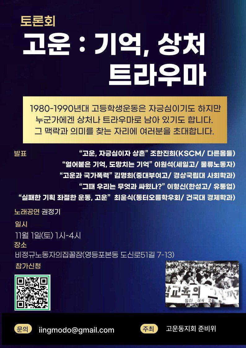 * '고운'이란? : 고등학생운동(고운)은 1987년 전후로 발전한 중·고등학생들의 조직적이고 집합적 운동입니다. 직선제 학생회 쟁취 투쟁, 사학 비리 척결, 학생 자치 활동 보장과 보충·자율학습 폐지 등의 운동을 전개해 나갔고, 1989년 전국교직원노동조합 사수 투쟁으로 크게 발전했습니다. 청소년인권운동에서 고등학생운동(고운)은 ‘전사(前史)’라고 불리곤 합니다.