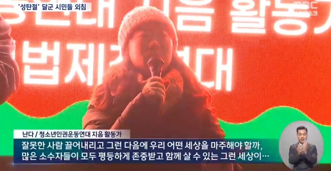 제가 활동하는 단체에서는 '어린 사람은 아랫사람이 아니다' 라는 캠페인을 하고 있어요. (...) 어린이, 청소년을 없는 존재처럼 취급하거나 쉽게 반말을 하거나 미래의 존재로만 이야기되는 걸 보면서 '아랫사람'으로 대하는 게 문제라는 이야기를 꾸준히 하고 있습니다. (...) 윤석열 우리가 탄핵시키고, 잘못한 사람 끌어내리고, 그 다음에 우리는 어떤 세상을 마주해야 할까. 어린 사람이 아랫사람이 아니어야 하는 것처럼 우리 사회에서 아랫사람으로 대해지는 많은 소수자들이 평등하게 존중받고 함께 살 수 있는 세상, 그런 세상이 정말 평등한 세상이라고 생각합니다.