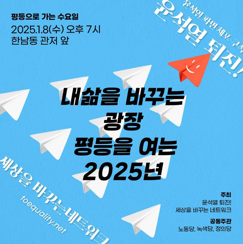 평등으로 가는 길이 민주주의를 지키는 가장 강력한 길이라는 점을, 윤석열 관저를 지키는 반평등세력을 보면서 느낍니다. 새해 열리는 <평등으로 가는 수요일>에 윤석열 체포·구속·파면과 함께 평등에 대한 희망, 우리가 바라는 세상과 정치에 대해 이야기하며 모두의 광장을 채웁시다!