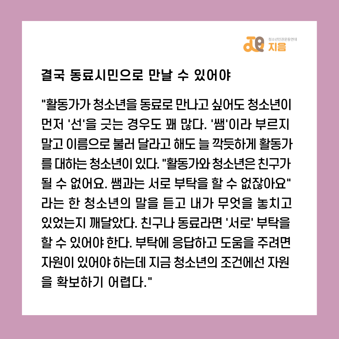 "청소년 사이의 동료성을 일구는 것도 어렵지만, 비청소년인 활동가와 청소년이 동료가 되는 길도 험난하다. 예결산 집행이나 정보접근성 등 활동가와 청소년 사이의 권한의 격차는 손쉽게 좁혀지지 않는다. 청소년운영위원회나 가족회의를 운영하는 것 정도로는 부족하다. (...) '이 정도면 동등하다'는 섣부른 착각을 경계할 때, 오히려 예민하게 현장을 살필 수 있다."